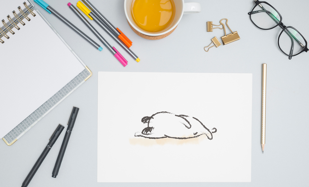 フレンチブルドッグの蛍を題材としてデザイナーがキャラクター化。 こちらは弊社デザイナーFさんが制作。1つ目のキャラクターデザイン「POPアイコンーHOTARUー」は、「カラーバリエーションやスクリーントーン使いなど遊べるデザインです。」とのこと。 2つ目のキャラクターデザイン「こんな日もあるよねー」では、「その時の自分の気持ちを蛍君で表してみました。気持ちに合わせたタッチで表現しています。」とコメントをいただきました。