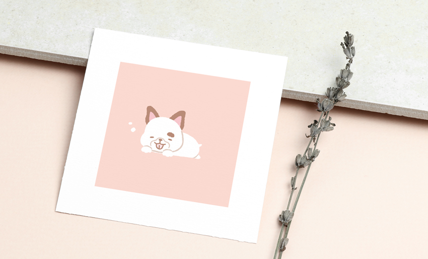 フレンチブルドッグの蛍を題材としてデザイナーがキャラクター化。 こちらは弊社デザイナーHさんが制作。1つ目のキャラクターデザイン「すやすやほたる」は、「寝ているほたるくんが可愛らしかったので まったり寝ているほたるくんを描きました。淡い色合いでゆるいタッチにしてまったり感を出しました。」とのこと。2つ目のキャラクターデザイン「おようふくほたる」では、「服を着ているほたるくんが可愛らしかったのでフードをかぶったほたるくんを描きました。 いろんなお洋服を着たほたるくんがいたら可愛いだろうなと思います。」とのコメントを頂きました。