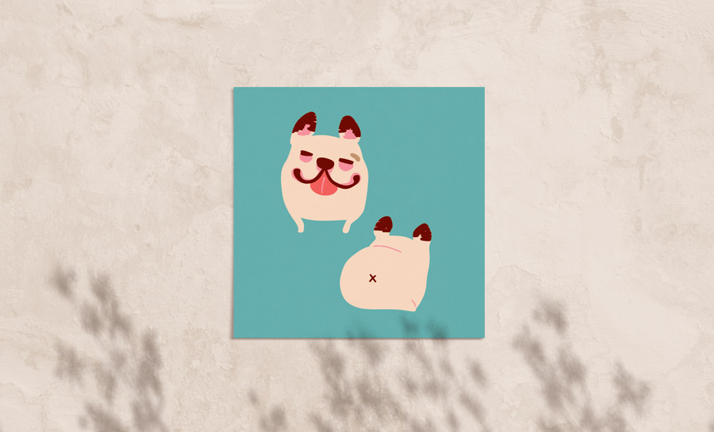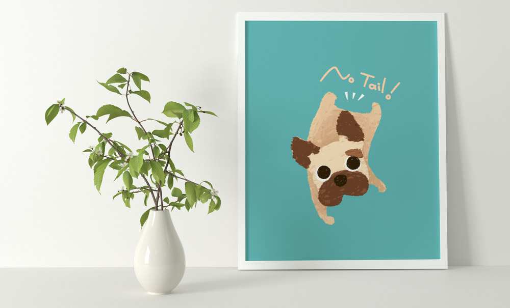 フレンチブルドッグの蛍を題材としてデザイナーがキャラクター化。 こちらは弊社デザイナーIさんが制作。1つ目のキャラクターデザインは、「ほたるちゃんのチャームポイントはしっぽがないこと。そこをポイントにしたくてこの構図にしました。見ているこちらがほっこりしてくるような愛くるしさを表現するため温かみの出るタッチにしています。」とのこと。 2つ目のキャラクターデザインでは、「目いっぱいに飛び込んでくる笑顔がとっても可愛かったので顔パーツを大きく、体を思い切りデフォルメしました。ゆるいタッチで、フレンチブルドッグの肉感が出ることを狙っています。」とコメントをいただきました。
