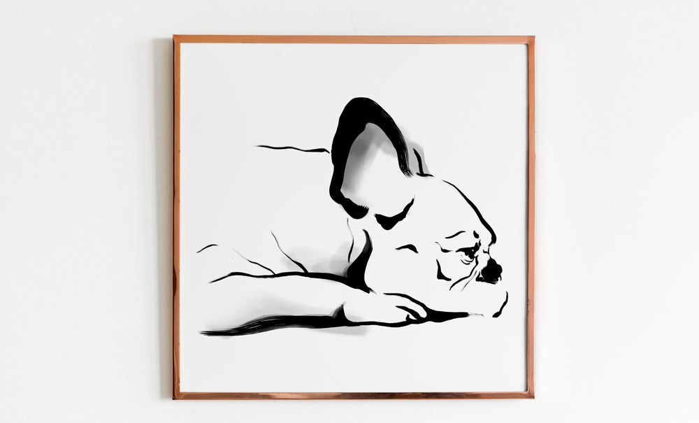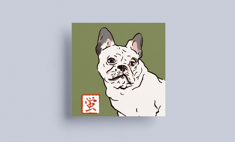フレンチブルドッグの蛍を題材としてデザイナーがキャラクター化。 こちらは弊社デザイナーKさんが制作。1つ目のキャラクターデザインは、「蛍くんは京都在住のフレンチブルドッグなので、和をテーマに作成致しました。浮世絵風のイラストなので 単体で抜き出すと役者絵のようになります。これを浮世絵の中に忍ばせ、蛍君を探せ!といった遊び心あるイラストにしても楽しそうです。」 2つ目のキャラクターデザインでは、「蛍くんは京都在住のフレンチブルドッグなので、和をテーマに作成致しました。他の和の要素がなくても単体で見て和と感じるシンプルで強い絵を目指しました。」とコメントをいただきました。