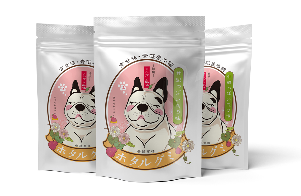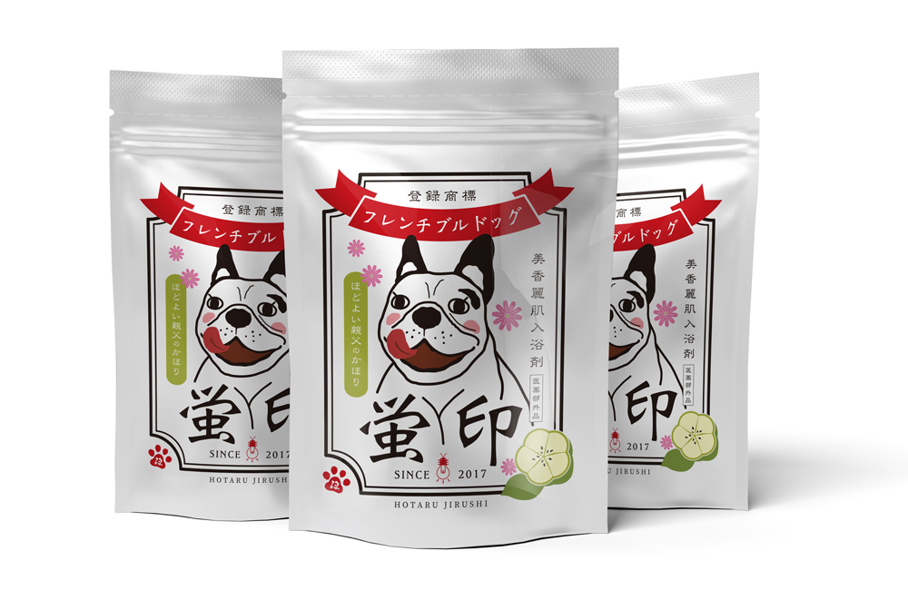 フレンチブルドッグの蛍を題材としてデザイナーがキャラクター化。 こちらは弊社デザイナーMさんが制作。1つ目のキャラクターデザインは、「お菓子のパッケージをイメージ」。 2つ目のキャラクターデザインでは、「入浴剤のパッケージをイメージ」。単にキャラクターデザインを制作するだけでなく、それを利用したグッズ展開やパッケージデザインを絡めて制作してをしてみたとのことでした。