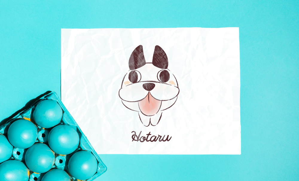 フレンチブルドッグの蛍を題材としてデザイナーがキャラクター化。 こちらは弊社デザイナーSさんが制作。1つ目のキャラクターデザインは、「実際にはない色使いでカラフルさを出して、ファンシーな感じを演出しています。」とのこと。2つ目のキャラクターデザインでは、「顔が印象的だったので、顔がメインになるようなアングルで描いています。ホタルが持っているホンワカな感じを出すために、手描き感とボカシでソフトで柔らかい感じ に仕上げました。」とのコメントを頂きました。