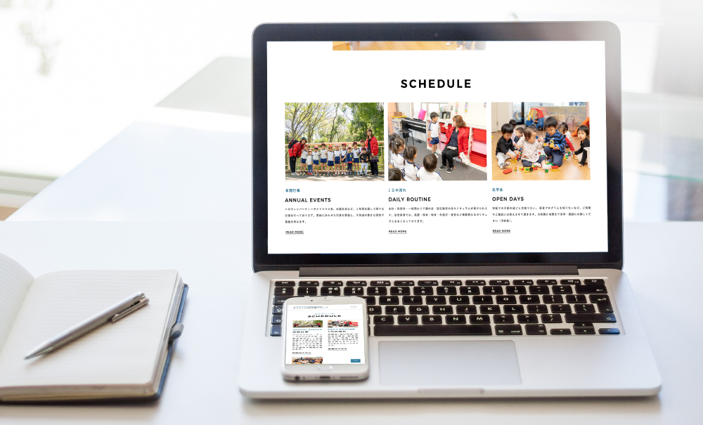 今回、WEB/ホームページのリニューアルをご依頼いただきました。PC・タブレット・SPへの対応をご希望とのことでレスポンシブデザインで制作させていただきました。また、カメラマン同行で撮影を行い、子どもたちの表情を引き出した写真を活用することで、園の雰囲気が伝わるWEBデザインに仕上げました。WEB/ホームページ公開後は、早速問い合わせが増えたとの嬉しい声を頂きました。