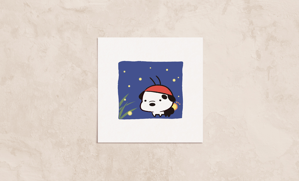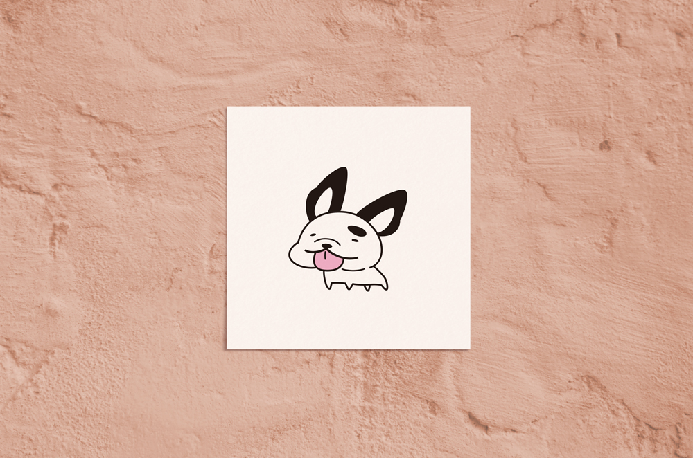 フレンチブルドッグの蛍を題材としてデザイナーがキャラクター化。 こちらは弊社デザイナーUさんが制作。1つ目のキャラクターデザインは、「名前がほたるなので、虫のほたるを着てもらいました。」とのこと。 2つ目のキャラクターデザインでは、「舌と耳が特徴的だと感じたので大きく描きました。口が笑っているように見えたので、そこもちょっと意識しました。」とコメントをいただきました。